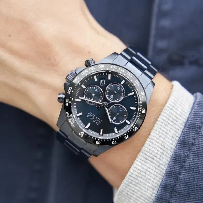 They say you should never meet your heroes – but this one certainly won’t disappoint you. Just like the man who wears it, this masculine model confidently combines resolute ruggedness with sophisticated style. This chronograph features a 43mm blue Ion Plated case with crown protection, tachymeter bezel, blue dial, blue IP bracelet and push button deployment clasp.