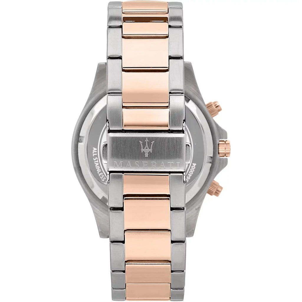 Silver-tone stainless steel case with a two-tone (silver-tone and rose gold-plated) stainless steel bracelet. Uni-directional rotating silver-tone stainless steel with a black ring bezel. Black dial with luminous rose gold-tone hands and index hour markers. Minute markers around the outer rim. Dial Type: Analog. Luminescent hands and markers. Date display between the 4 and 5 o'clock positions. Chronograph - sub-dials displaying: 24 hours, 30 minutes, 60 seconds. Quartz movement. Scratch resistant mineral crystal. Screw down crown. Screwed case back. Round case shape, case size: 44 mm, case thickness: 11.4 mm. Band width: 22 mm. Fold over clasp with a safety release. Water resistant at 100 meters / 330 feet. Functions: chronograph, date, hour, minute, second. Sfida Series. Casual watch style. Maserati Sfida Chronograph Quartz Black Dial Men's Watch R8873640002.