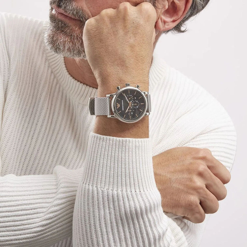Emporio Armani Luigi Chronograph Quartz Black Dial Silver Mesh Bracelet Watch For Men - AR11429