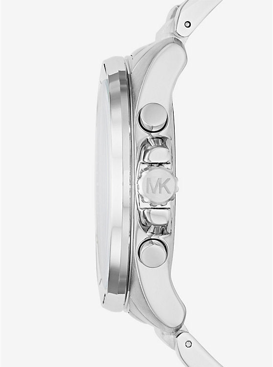 Men's watch from the brand Michael Kors MK8437. This watch has a round, silver with gold case. The glass is made of hardened mineral. The diameter of the case is 44 (mm). The watch has an analog display with a chronographic movement. The dial is blue in color. The case is made of steel and the strap is made of steel. The watch is water resistant up to 10 ATM.
