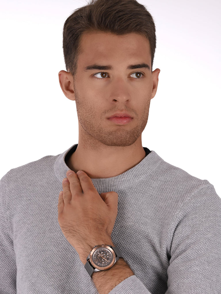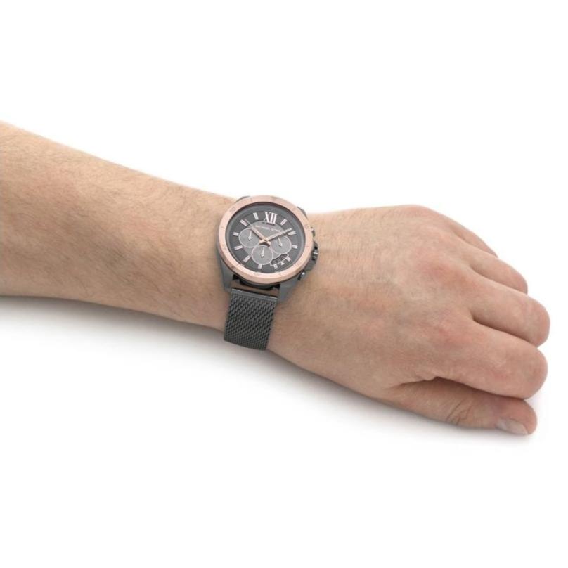 Michael Kors' Brecken 45mm watch features a grey brushed dial with rose gold-tone stick indexes, gunmetal case with rose-gold topring, chronograph movement and gunmetal stainless steel mesh bracelet.