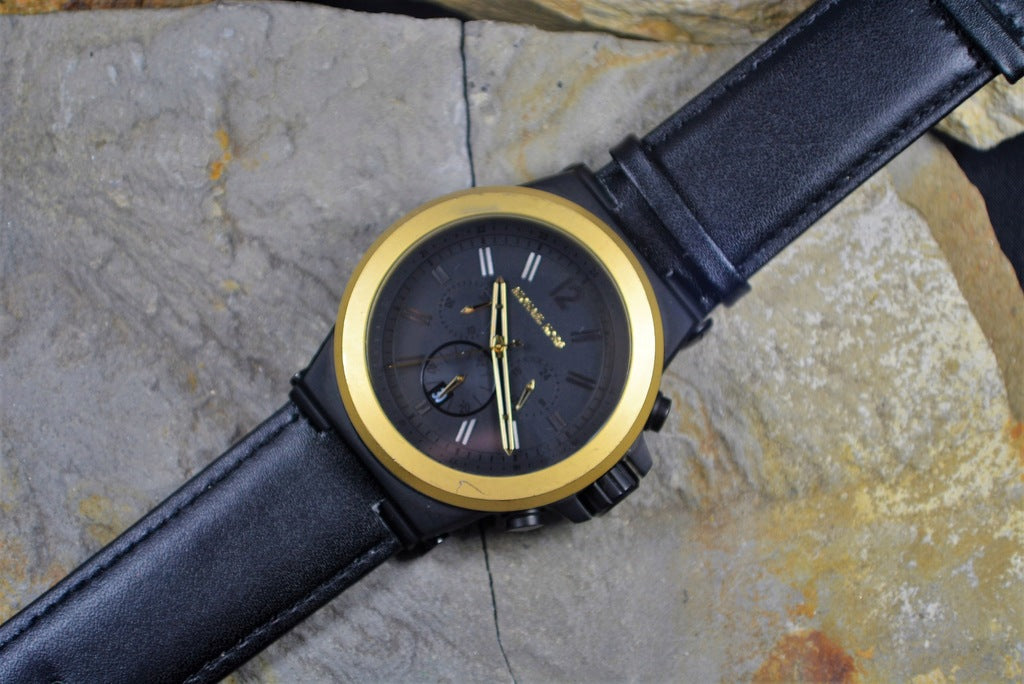 Stainless steel case with a black Silicone Strap . Fixed gold-tone bezel. Black dial with luminous gold-tone hands and index hour markers. Arabic numeral marks the 12 o'clock position. Minute markers around the outer rim. Dial Type: Analog. Luminescent hands and markers. Date display at the 6 o'clock position. Chronograph - three sub-dials displaying: 60 second, 30 minute and 24 hour.