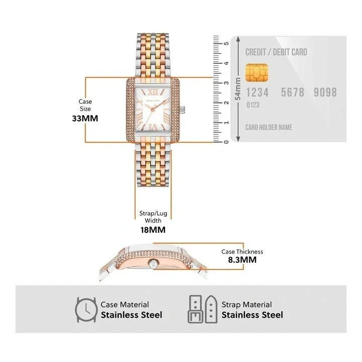 Expertly crafted with a tri-tone design, the Michael Kors Emery watch is a stunning timepiece for the modern woman. The white dial adds a touch of sophistication, while the durable materials ensure long-lasting wear. Stay stylish and on time with this elegant watch.