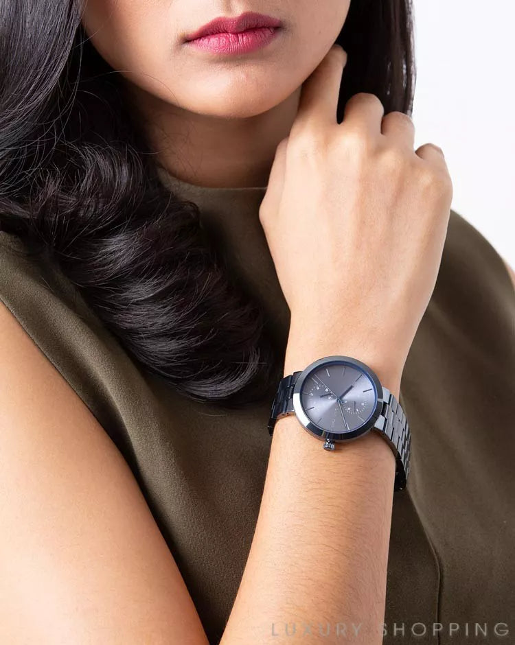 Navy blue ion-plated stainless steel case and bracelet. Fixed navy blue ion-plated bezel. Navy blue dial with blue hands and index hour markers. Dial Type: Analog. Date display at the 12 o'clock position. Two displays showing: date, and 24 hours. Quartz movement. Scratch resistant mineral crystal.
