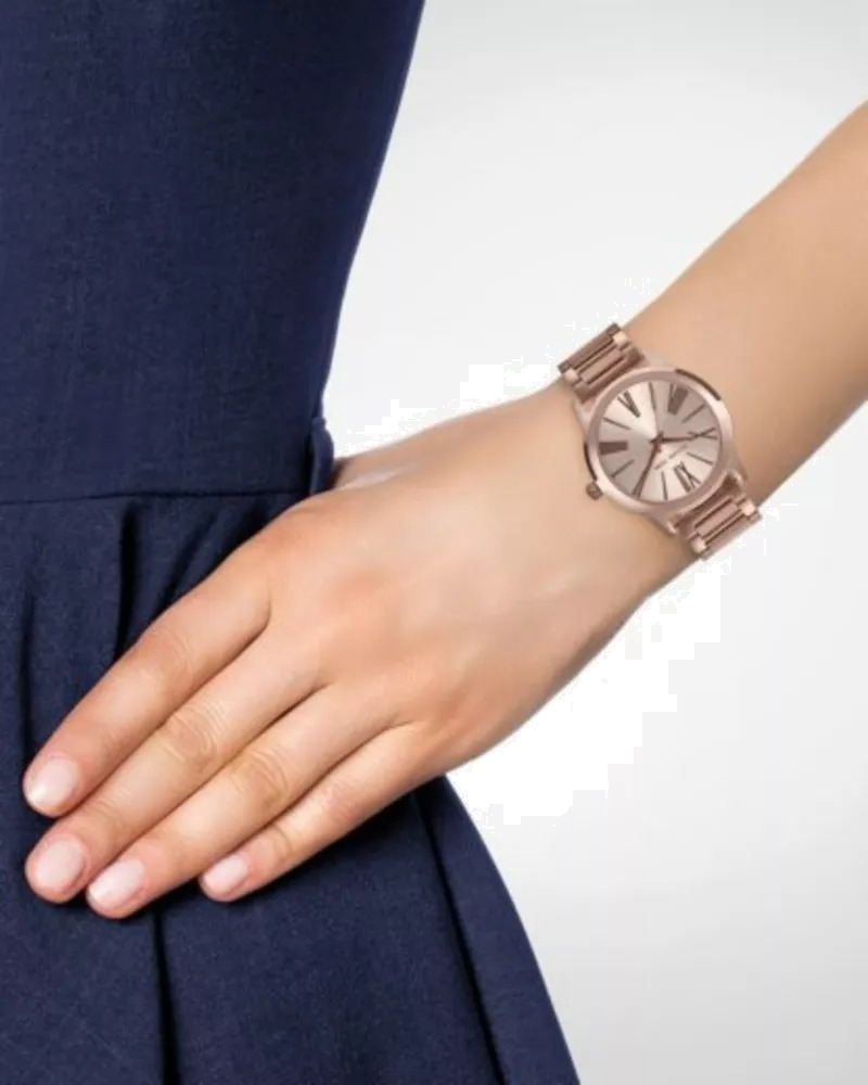 Sleek and chic, the monochromatic rose gold-tone Michael Kors Hartman watch features a menswear-inspired, oversized dial and thick 3-link bracelet.
