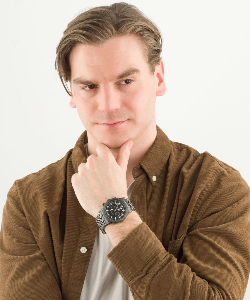 Our 43mm Men's Hutton watch is stylish and sophisticated. Featuring a textured topring and subtle logo dial, this black IP stainless steel watch is a timeless classic.