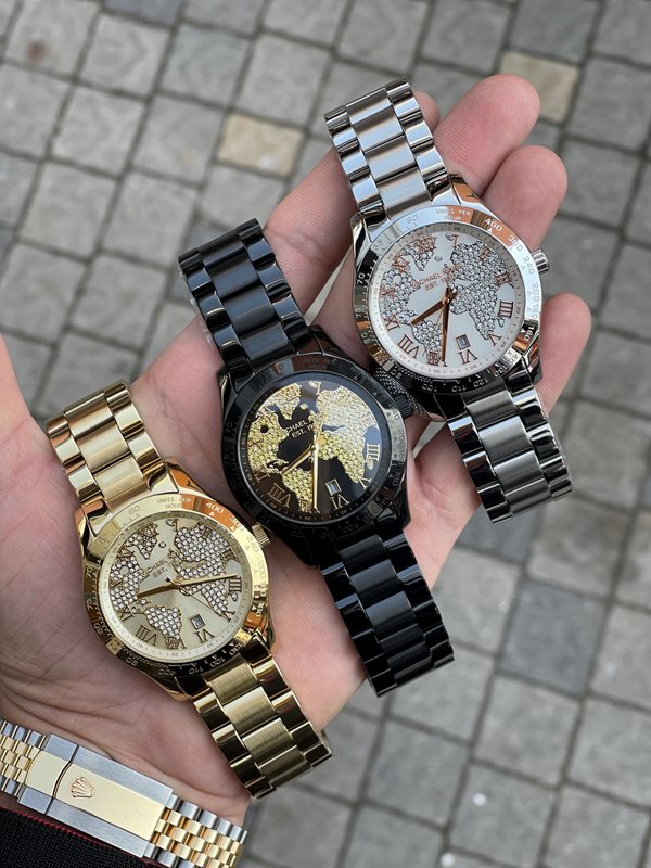 • Watch featuring round dial with sparkling map design, date window at 6 o'clock, and Roman numeral markers