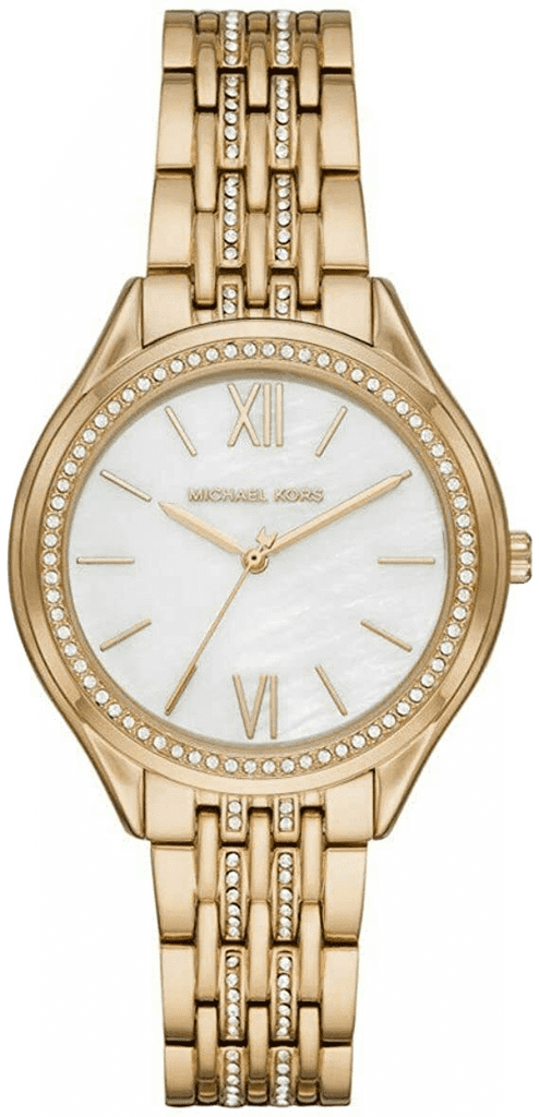 Michael Kors' Mindy 36mm watch features a white mother-of-pearl dial with gold-tone stick and Roman numeral indexes, three-hand movement and gold-tone Steel seven-link bracelet with glitz-covered center links.