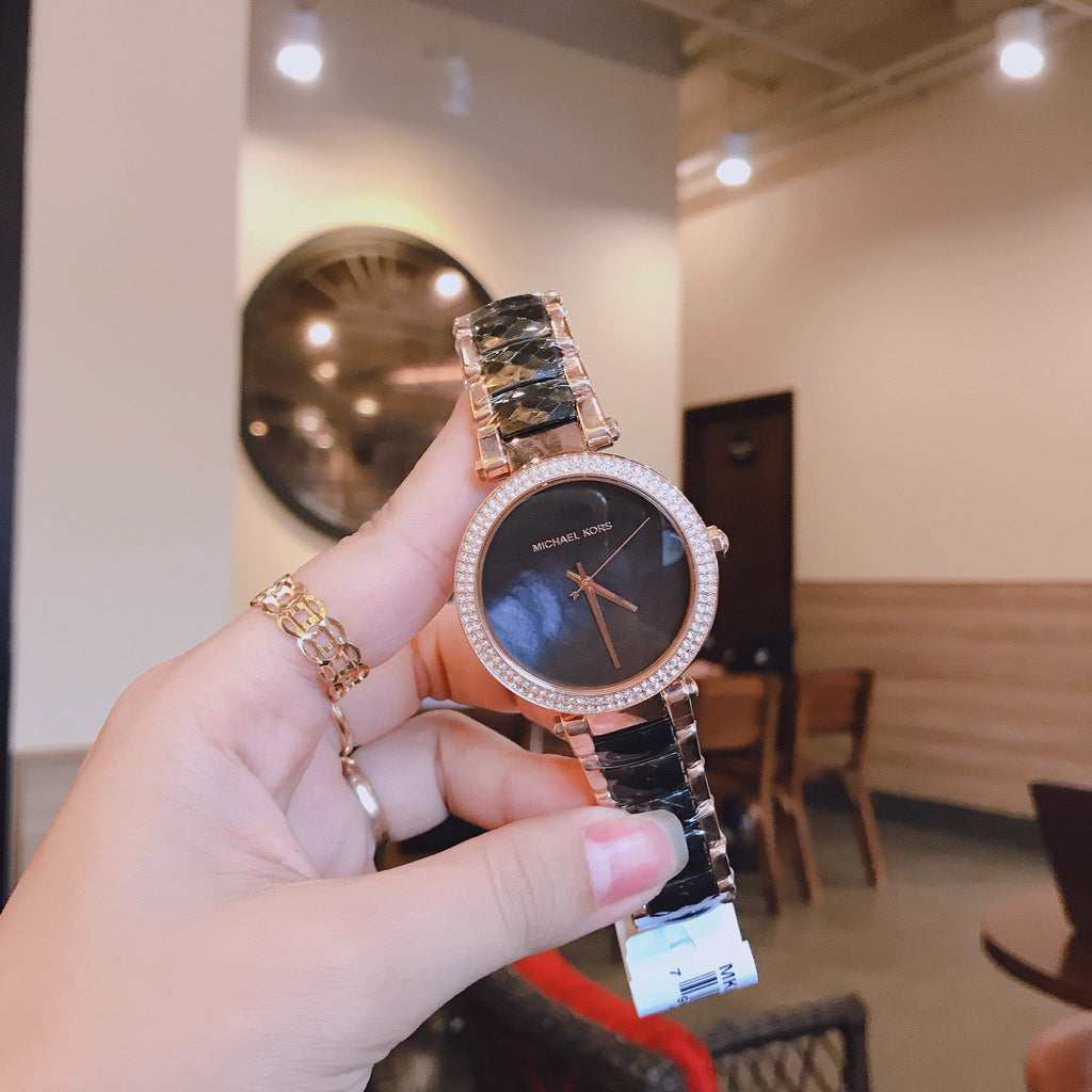 The Michael Kors Parker watch exudes glamour. Polished rose gold-tone and faceted black acetate center links alternate on the bracelet; and the black mother-of-pearl dial is finished with a pave crystal top ring.