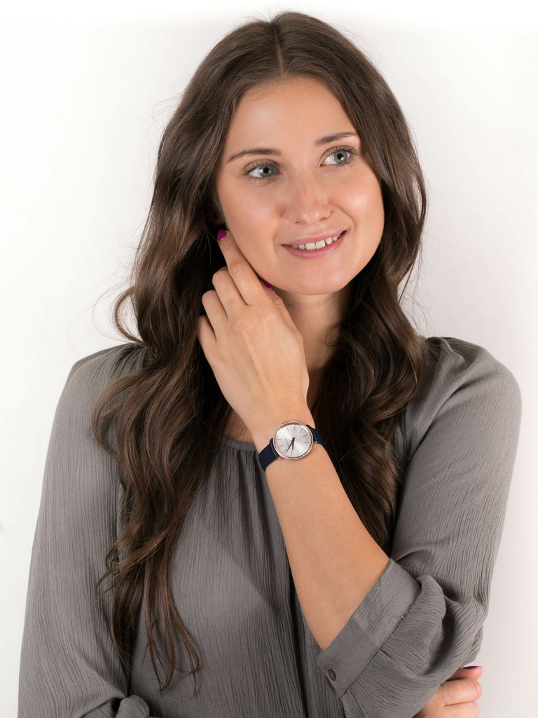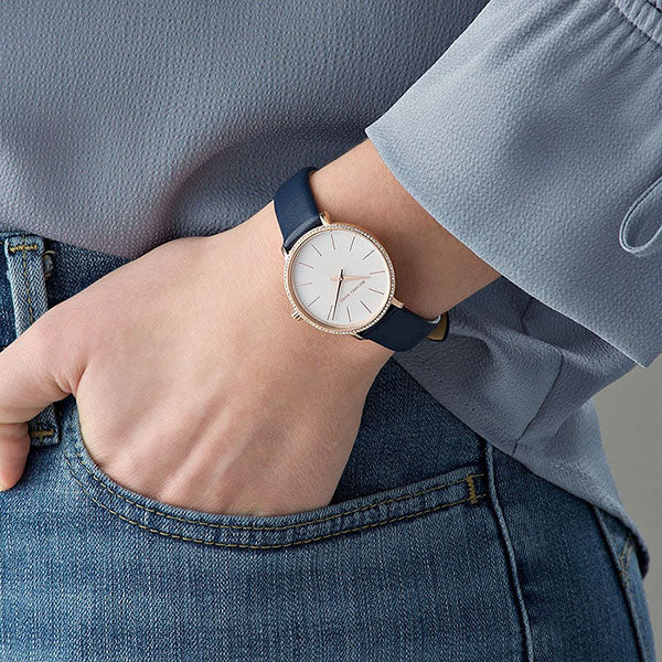 The traditional look of the Michael Kors MK2804 Pyper wristwatch works well with all kinds of outfits. The genuine 14 mm leather strap is in dark blue and the 32 mm steel case is in red gold. The watch features mineral glass and is set with clear cubic zirconia stones.