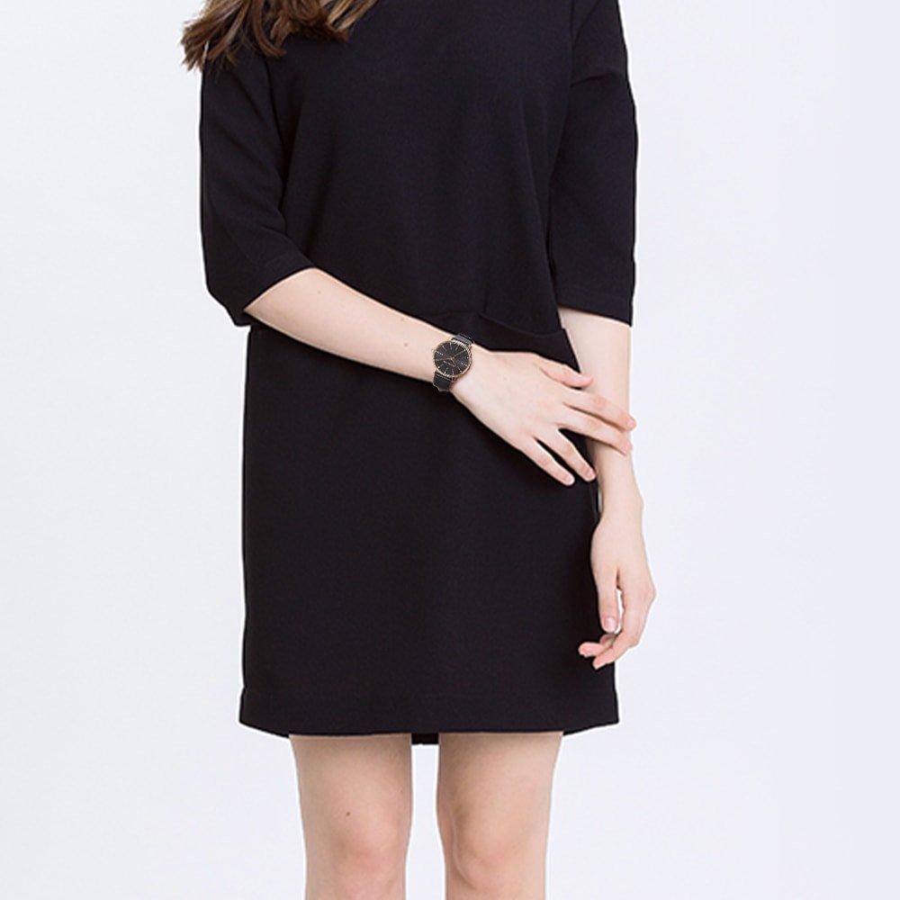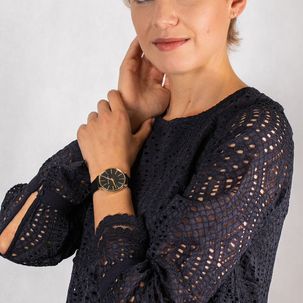 The Michael Kors Pyper MK2747 watch is a classic women's model. On a black strap made of leather, there is a gold-tone steel envelope, which is cast in high-quality stainless steel. The dark but legible dial of the Pyper model serves as a backdrop for gold indexes decorated with crystals.