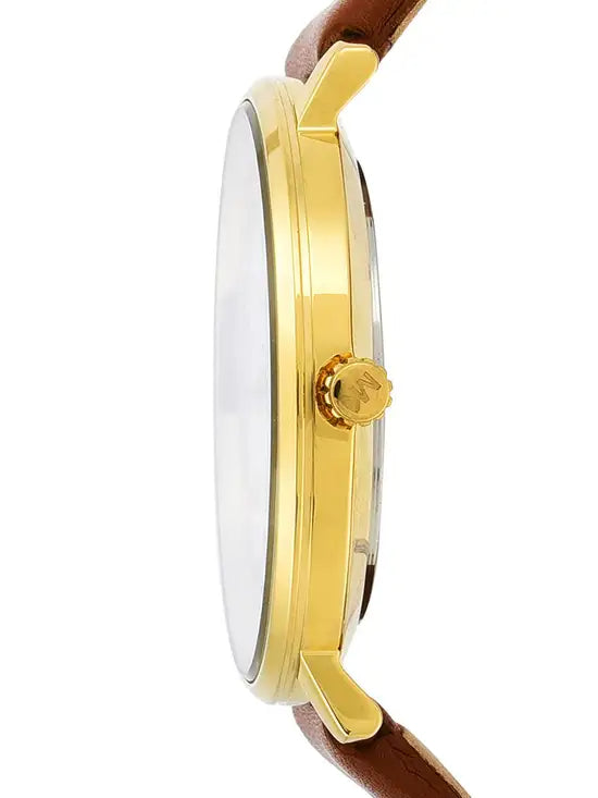 The 38mm gold-plated stainless-steel cases surrounds the beautiful white dial, complete with elegant gold-toned hour baton markers and hands, as well as signature Michael Kors branding below the 12 o’clock marker. The tan leather strap contrasts perfectly with the dial, and adds a luxurious touch. The Ladies Michael Kors Pyper Watch is a stylish fashion accessory that will enhance whatever you wear with it.