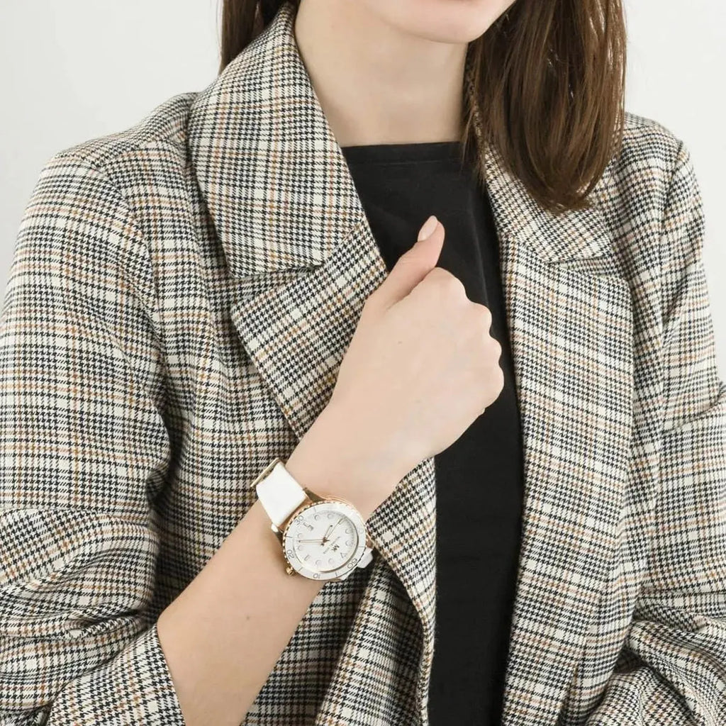 This Michael Kors Runway watch with 40mm case and bezel with tachymeter display in white enamel has a 3-hand movement, a white textured dial with white enamel dot indices and a white silicone strap.
