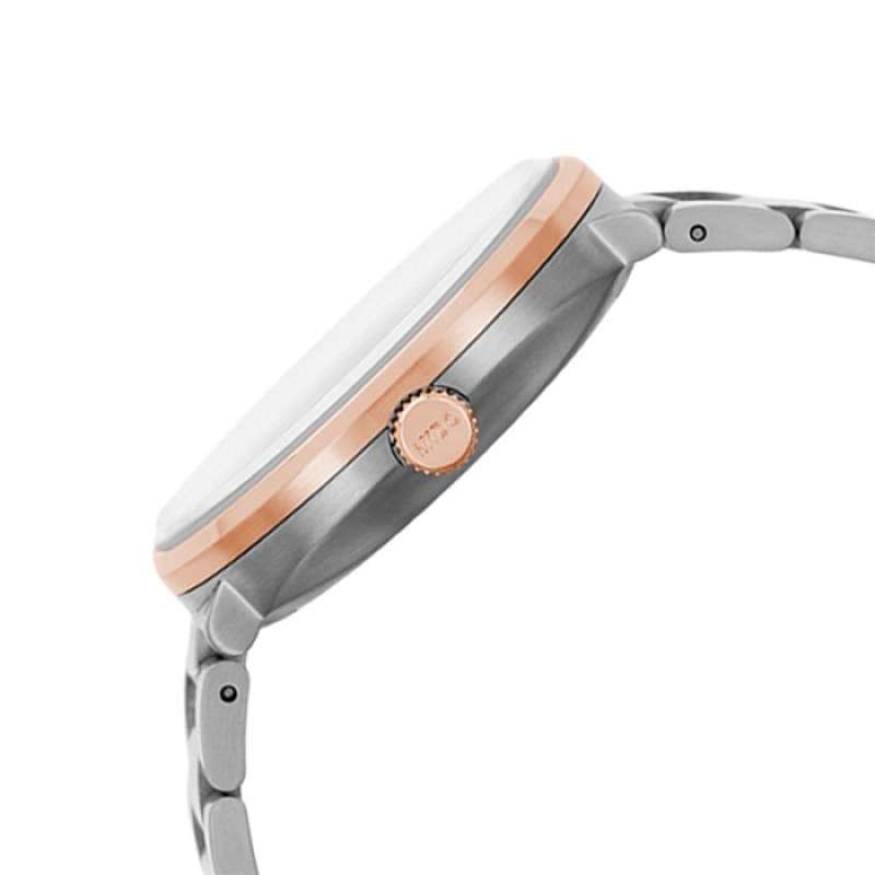 Stainless steel case with a two-tone (silver-tone and rose gold-tone PVD) stainless steel bracelet. Fixed rose gold PVD bezel. Silver dial with luminous rose gold-tone hands and index hour markers. Arabic numeral minute markers (at 5 minute intervals). Minute markers around the outer rim.