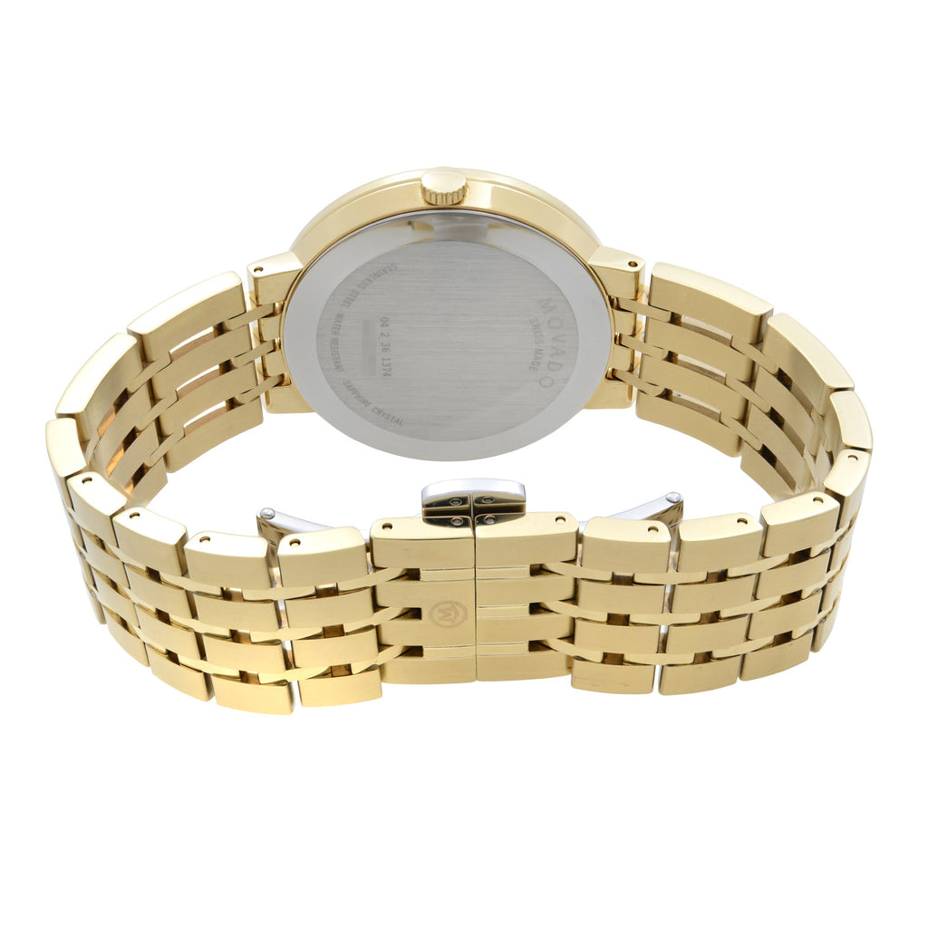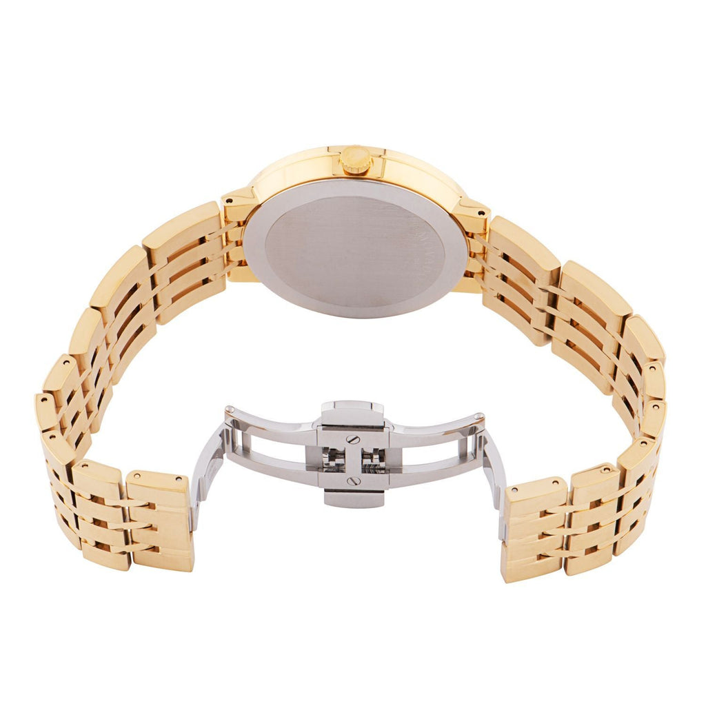 Black dial enhanced by gold-tone dauphine-style hands. Yellow Gold PVD stainless steel case with a yellow gold pvd stainless steel band. Quartz movement. 30 meters / 100 feet water resistance. Fixed bezel. Scratch Resistant Sapphire crystal. Solid caseback. Fold Over with Push Button Release clasp. Pull / Push crown. Case size 39 mm x 4.63 mm. Band 22 mm x long. Movado 0607059 Esperanza Watch.