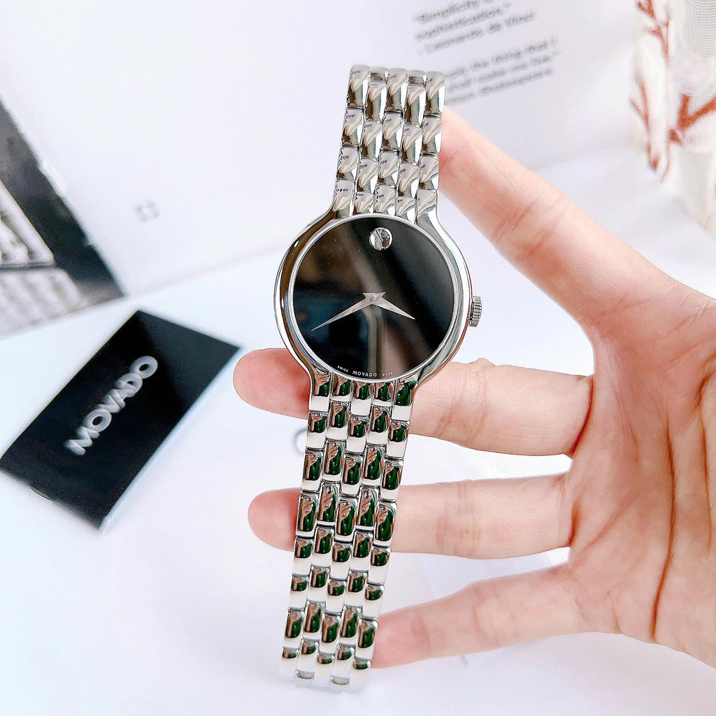 This Movado Classic Quartz watch for men features a sleek black dial and a silver steel strap. Crafted with precision and style, this watch is perfect for any formal occasion. Its reliable quartz movement ensures accurate time-keeping. A must-have accessory for the modern man.