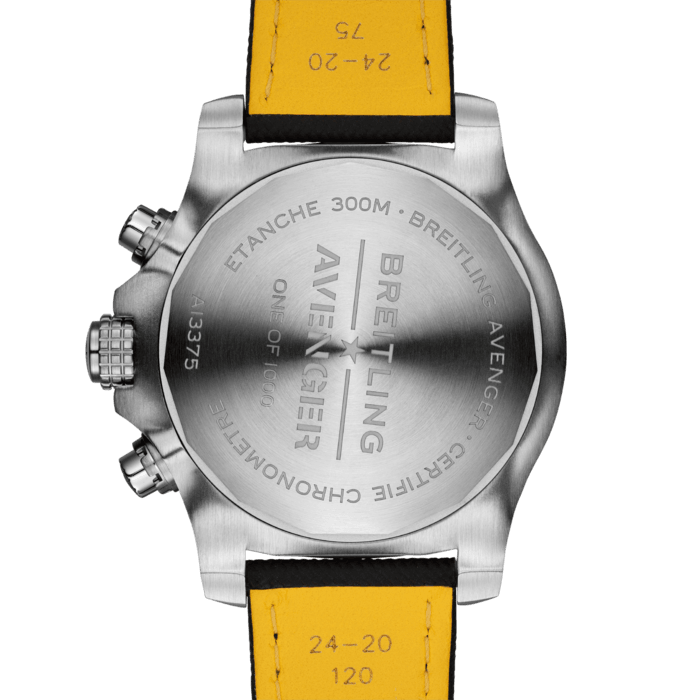 Bold, extremely robust and shock resistant, the Super Avenger Chronograph 48 makes a big “here I am” statement. As a true Breitling Avenger, it can be used wearing gloves and offers unrivalled safety and reliability to any airborne adventurer. Limited to 1000 pieces, this Super Avenger Chronograph 48 features a sturdy oversized 48 mm stainless-steel case, unique white dial and a choice of a stainless-steel bracelet, or a black military leather strap that fits either a stainless-steel pin buckle or folding clasp. Thanks to its rugged bezel and its special grip pattern on the crown and chronograph pushers, the Super Avenger Chronograph 48 can be easily operated wearing gloves.