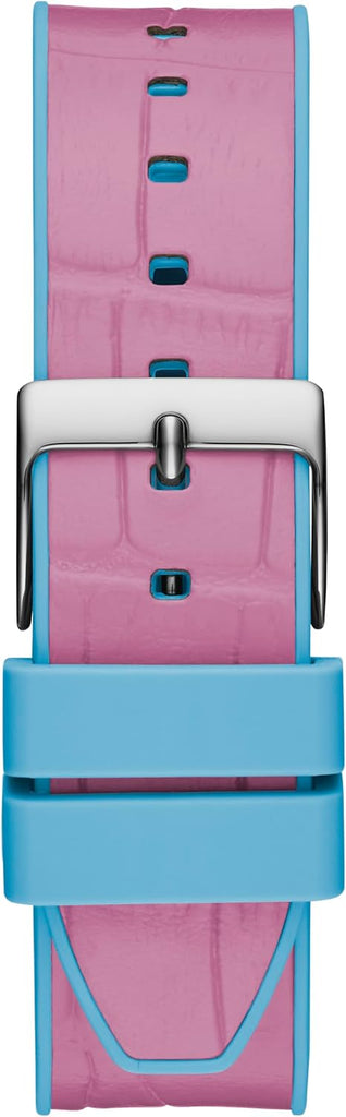 Introducing the Guess GW0553L5 Fusion Multi-Function, a vibrant timepiece that combines style with functionality. This watch features a silver stainless steel case with a crystal embellished bezel, adding a touch of glamour to its design. The pink cut-out dial offers a unique and playful aesthetic, complemented by a pink and aqua blue strap that features both leather and silicone for comfort and durability.