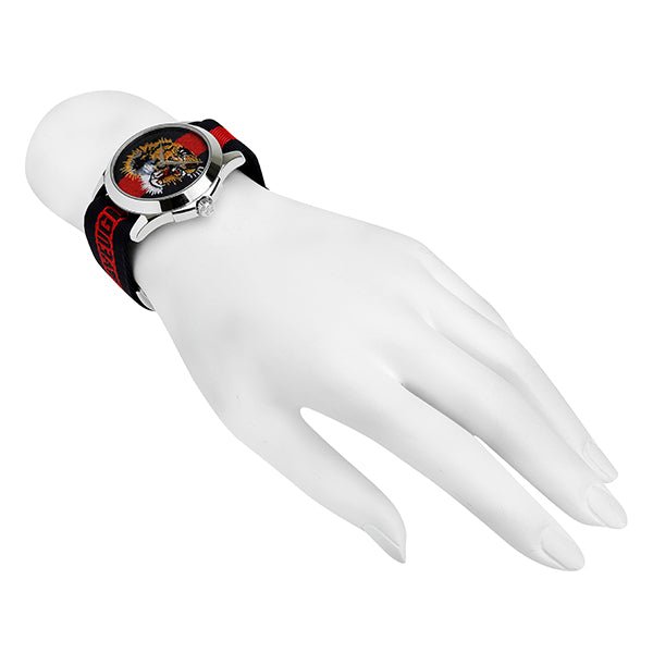 Silver-tone stainless steel case with a blue and red nylon strap. Fixed silver-tone stainless steel bezel. Blue and red (tiger motif) dial with silver-tone hands. No markers. Dial Type: Analog. Quartz movement. Scratch resistant sapphire crystal. Pull / push crown. Solid case back. Round case shape. Case size: 38 mm. Case thickness: 8 mm. Band width: 18 mm. Tang clasp. Water resistant at 50 meters / 165 feet. Functions: hour, minute. Dress watch style. Gucci Le Marches des Marveilles Unisex Watch YA126495.