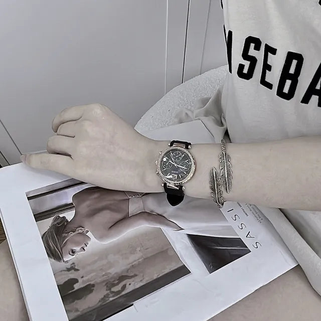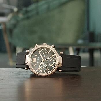 Classy & eye catching yet not over the top. Featuring modern designs to fit in with the "in crowd". GUESS delivers this stunning timepiece with a Rose Gold IP plated stainless steel case, 'Mother of Pearl' shimmering dial, smooth silicone band and a glitz top ring that completes the look.