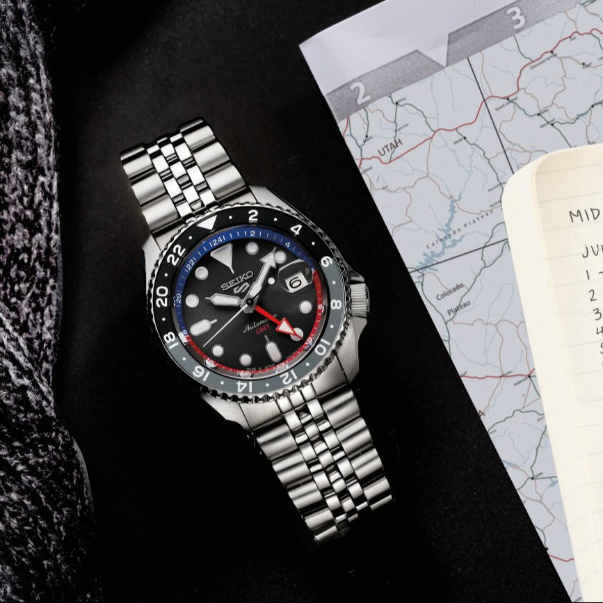 Seiko 5 Sports GMT; Pepsi Bezel Charcoal Men’s Watch; (model SSK019J1) is a striking and functional timepiece that blends classic design with modern features. Here are the key attributes: