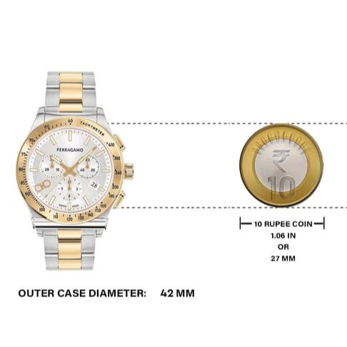 Add a perfect finishing touch to your look with this men's analog watch from Ferragamo. Its stainless steel strap vaunts a two tone hue that enhances the look of the watch. Safeguarded by a and functional on a quartz movement, the silver round dial is encompassed in a 42 mm case. It exudes plain three hands. Furthermore, it is complemented with a deployment clasp with push button clasp that ensures a secure fit on the wrist.