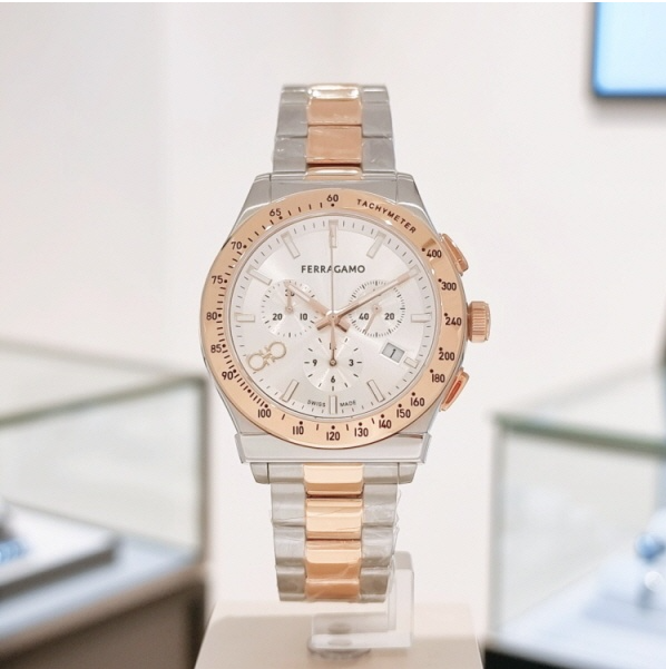 Enhance your style with the Salvatore Ferragamo 1927 Chrono Watch. This watch features a sleek two-tone steel strap and a silver dial with chrono function, making it both fashionable and functional. Perfect for the modern man who values both style and practicality.