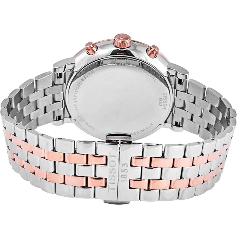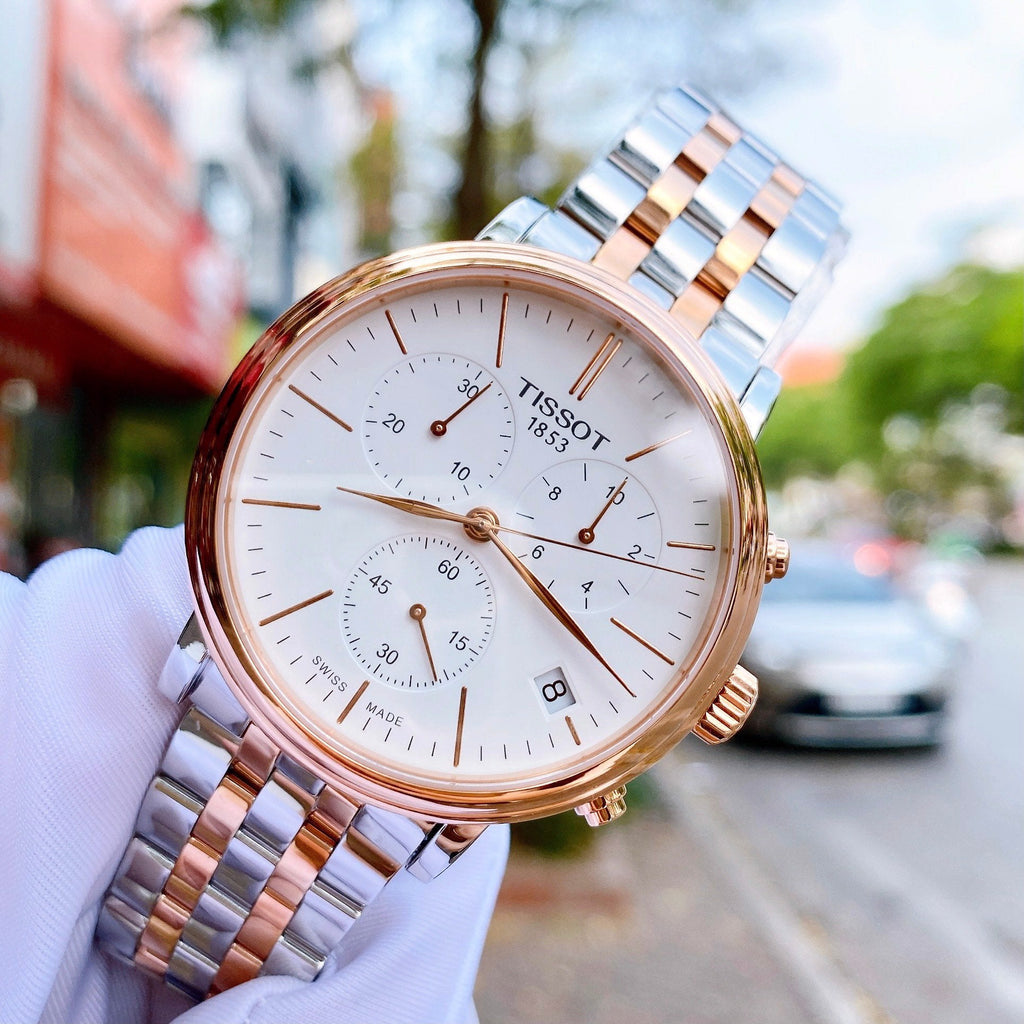 Tissot T122.417.22.011.00 Carson Chronograph Men’s Watch. The case is made out of silver stainless steel with a rose gold bezel, which stands for the high quality of the item, it has a white dial. This model has got 100 meters of water resistance. it can be worn in scenarios where it is likely to be splashed but not immersed in water and will be fine in rain. The watch is shipped with an original box and a guarantee from the manufacturer.