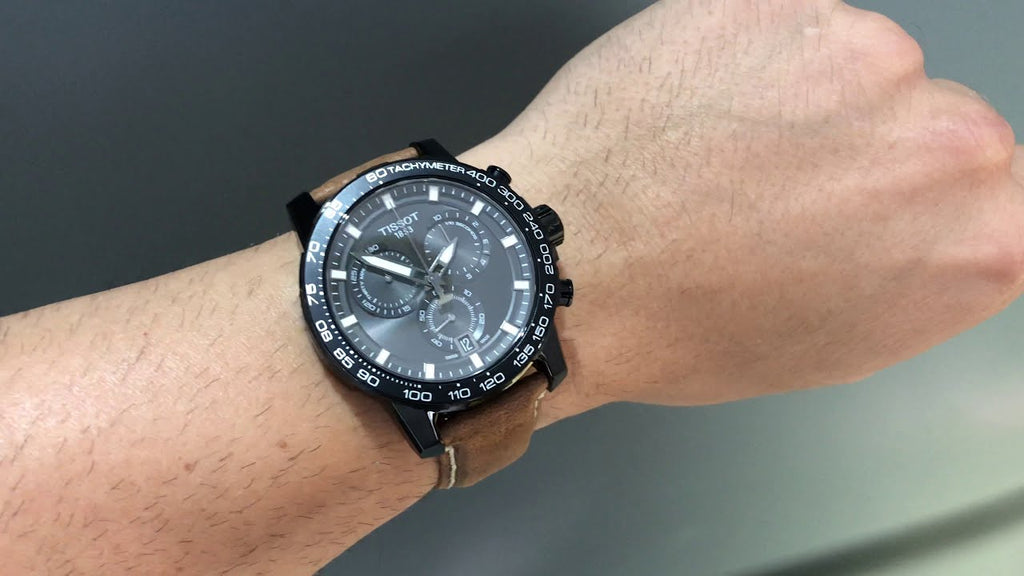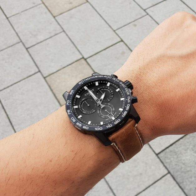 With a bold design, large 45.5mm case and chronograph functions, the Supersport Chrono makes an impressive addition to the Tissot collection. This mens Swiss-made watch has a scratch-resistant sapphire crystal, aluminium bezel ring, black dial and brown vintage hand-stitched leather strap.
