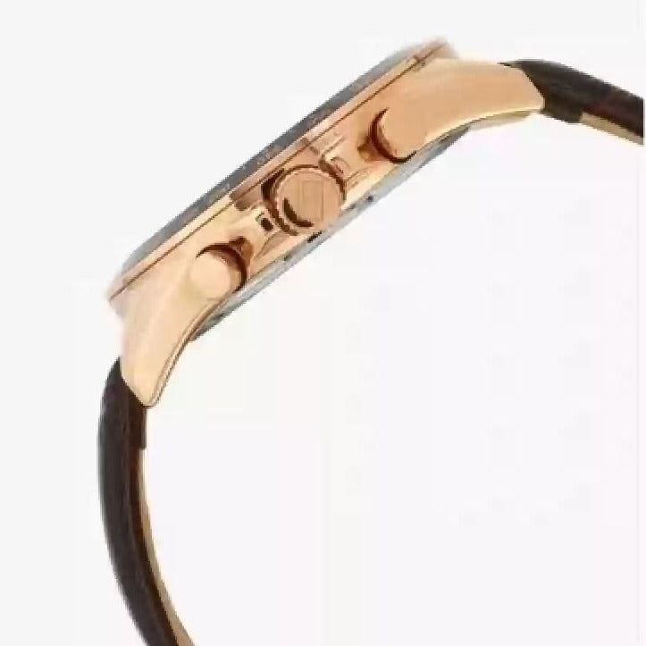 Rose gold-tone stainless steel case with a brown leather strap. Fixed rose gold-tone bezel with blue top ring showing tachymeter markings. White dial with luminous rose gold-tone hands and index hour markers. Arabic numeral marks the 12 o'clock position. Minute markers around the outer rim. Dial Type: Analog. Luminescent hands and markers.