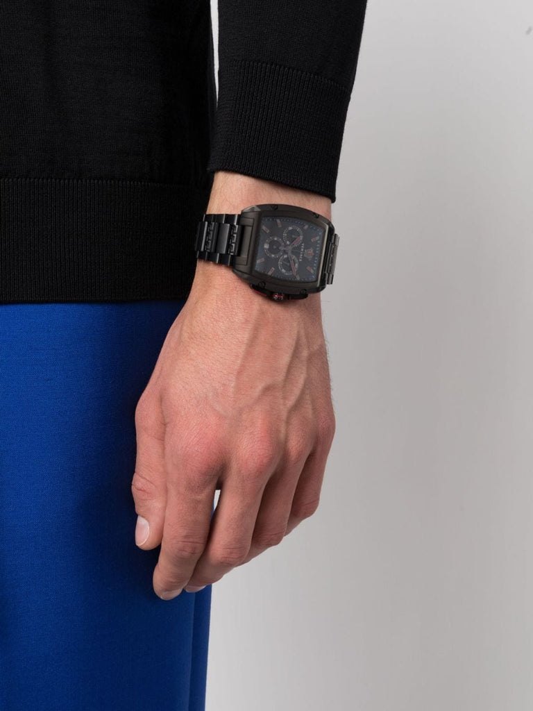 Following the latest trends, the collection embodies the Versace DNA in this bold tonneau case body. The watch hosts a chrono movement with 3 counters. To flag the silicon strap version where the Versace logo meets the Greca creating a new masculine and eye-catching pattern.