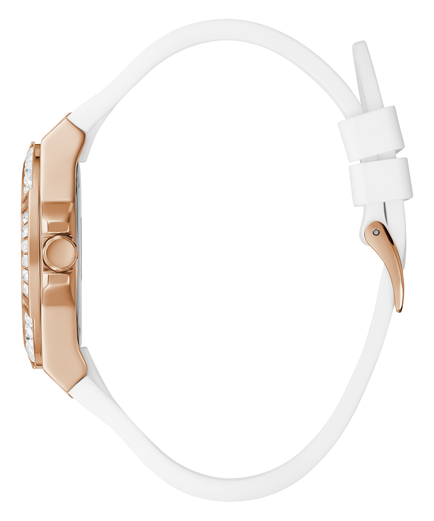 Guess Venus GW0118L4 is a casual watch that looks great combined with feminine styling. The product includes a white silicone strap and a rose gold case made of high-quality stainless steel. The white dial decorated with crystals includes a Day Date and 24-hour time. The device works based on a quartz mechanism.