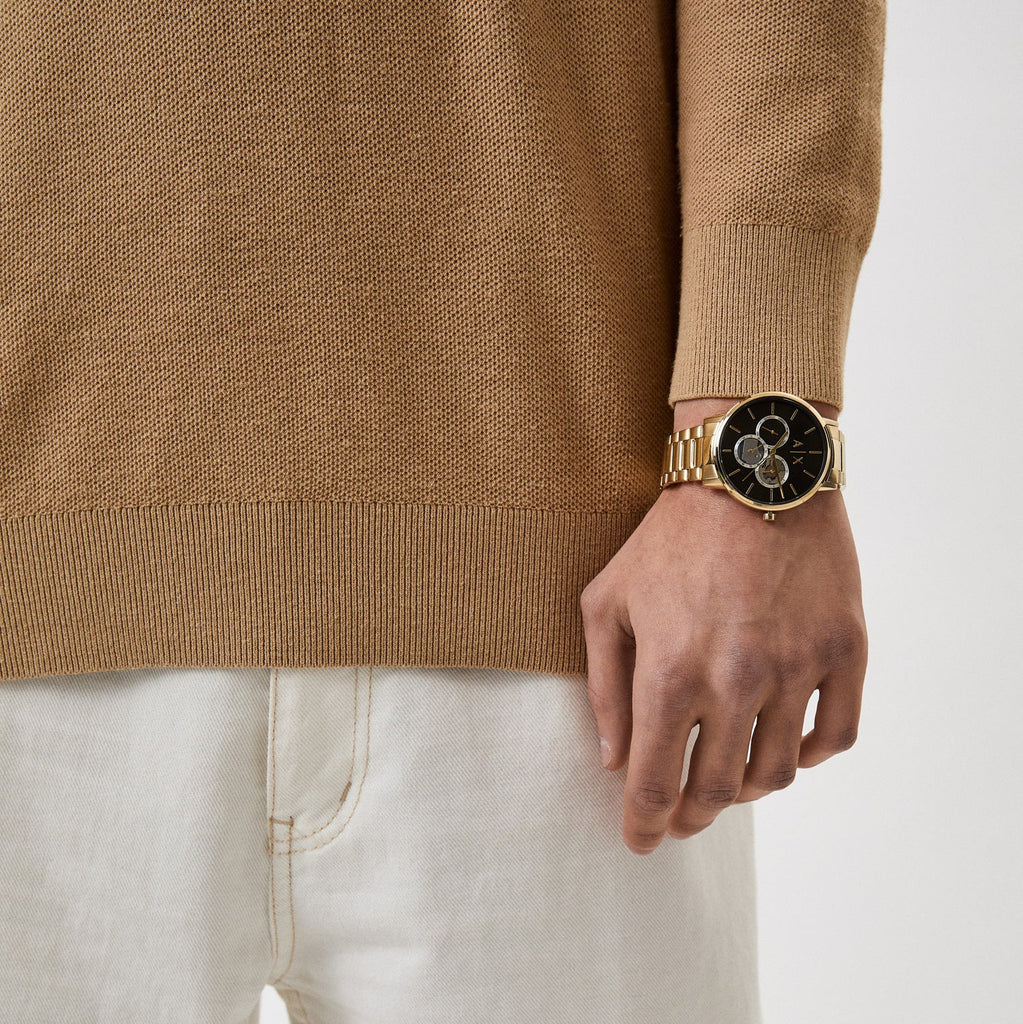 Elevate your style with the Armani Exchange Cayde Chronograph watch for men. With a sleek black dial and elegant gold steel strap, this watch exudes luxury and sophistication. The chronograph feature adds functionality while the durable materials ensure long-lasting wear. Elevate your look and make a statement with the AX2747.