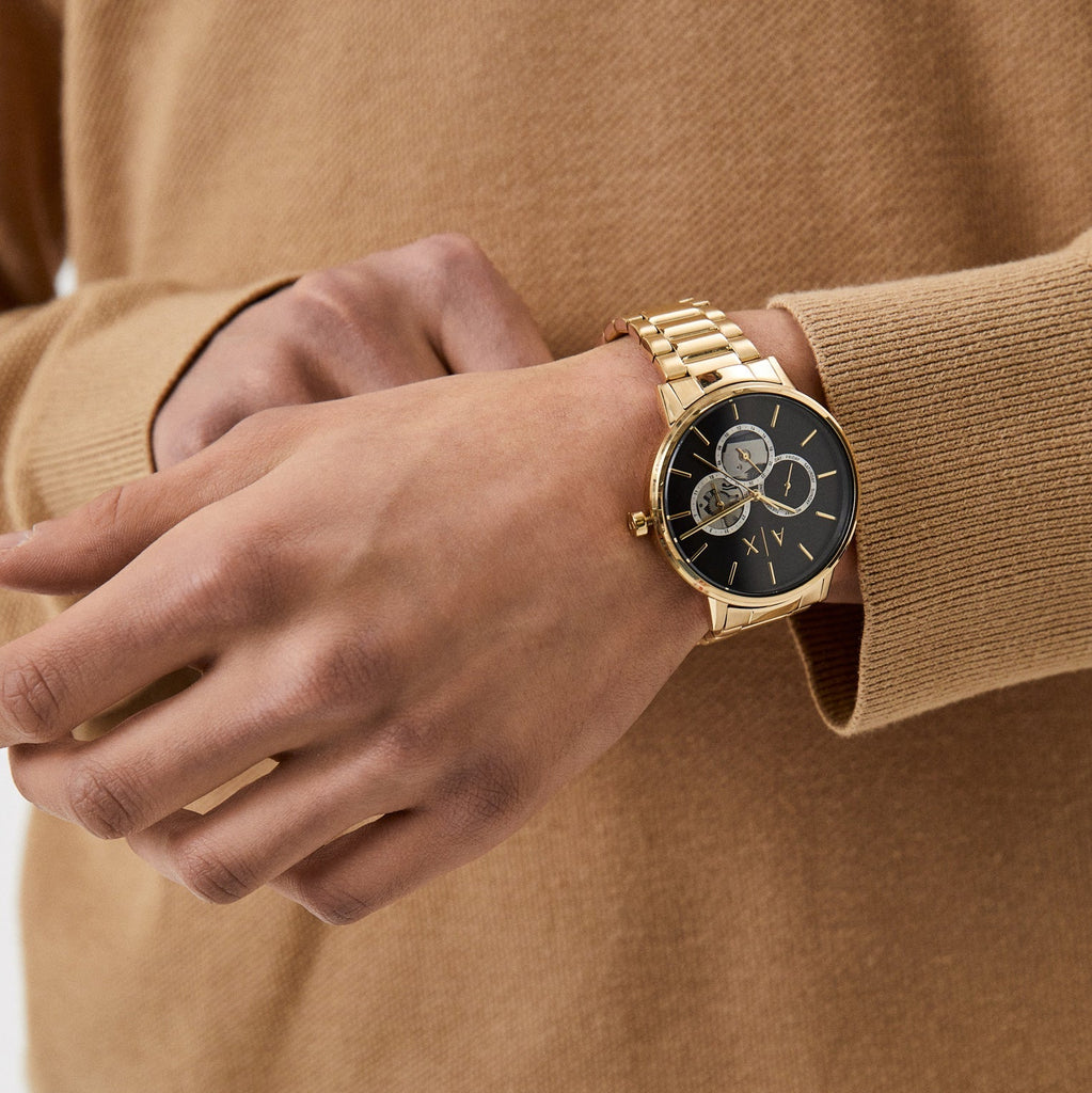 Armani Exchange's 42mm watch features a black skeleton dial, at least 50% recycled stainless steel case, multifunction movement and gold-tone stainless steel bracelet.