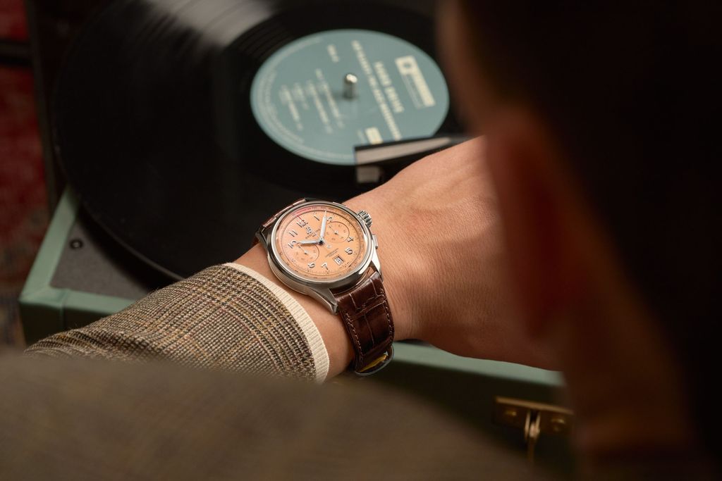 Retaining the distinctive characteristics of the vintage Premier models, this modern take on the collection features a smooth fixed bezel, twin-register dial, streamlined rectangular pushers, and applied Arabic numerals.