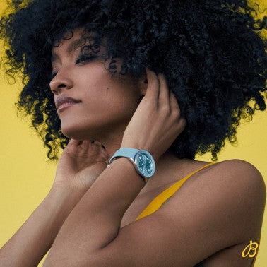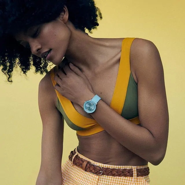 But what started as a neat 1950s divers’ watch has evolved into a sleek and fresh watch with a bit of sass and a lot of versatility. Think playsuits, pink flamingos, and headbands setting off perfectly flipped hair. Imagine a carefree and confident lady enjoying a seaside resort, sporting big sunglasses and swinging a straw handbag. ​