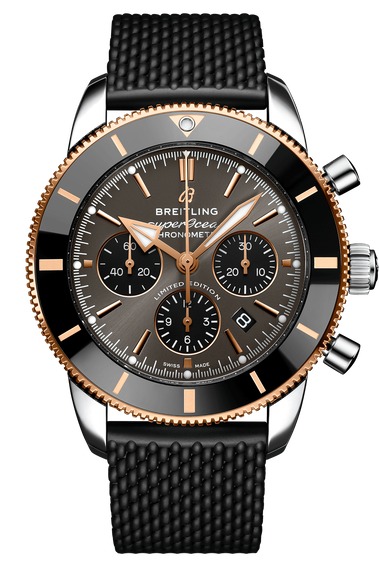 Featuring the iconic triangular-shaped hands as well as a unidirectional bezel with a polished ceramic ring, the Superocean Heritage is an elegant looking diver’s watch. Available here in stainless steel and 18k red gold, this Superocean Heritage B01 Chronograph 44 features a black-eye gray dial. Offered with a “mesh-styled” black rubber strap fitting a folding buckle, this Superocean Heritage is powered by the in-house Breitling Manufacture Caliber 01, a COSC-certified chronometer.