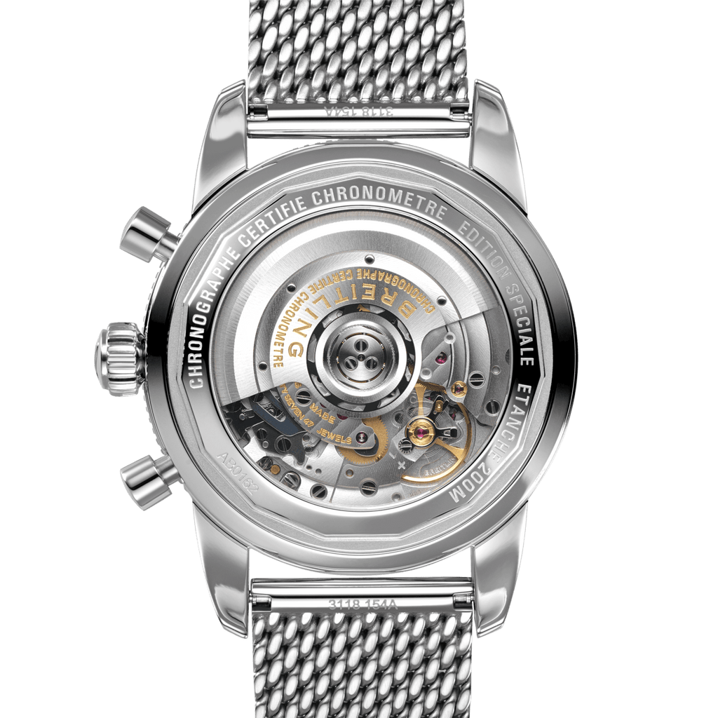 Featuring the iconic triangular-shaped hands as well as a unidirectional bezel with a polished ceramic ring, the Superocean Heritage is an elegant looking diver’s watch. Available in a variety of materials including stainless steel and 18k red gold, the Superocean Heritage B01 Chronograph 44 features a range of black, blue, silver, or green dials. Offered either with a matching mesh bracelet, or a “mesh-styled” rubber strap fitting a folding buckle, this Superocean Heritage is powered by the in-house Breitling Manufacture Caliber 01, a COSC-certified chronometer.
