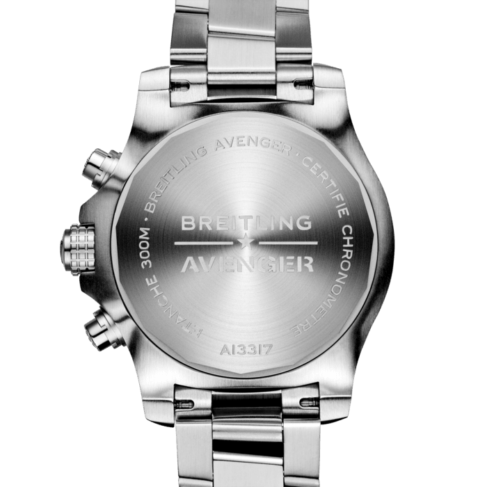 Bold, extremely robust and shock resistant, the Avenger Chronograph 45 combines precision with a powerful design. As a true Breitling Avenger, it can be used wearing gloves and offers unrivalled safety and reliability to any airborne adventurer. The Avenger Chronograph 45 features a sturdy 45mm stainless-steel case, black or blue dial and a choice of a stainless-steel bracelet, or matching black or blue military leather strap that fits either a stainless-steel pin buckle or folding clasp. Thanks to its rugged bezel and its special grip-pattern on the crown & chronograph pushers, the Avenger Chronograph 45 can be easily operated wearing gloves.