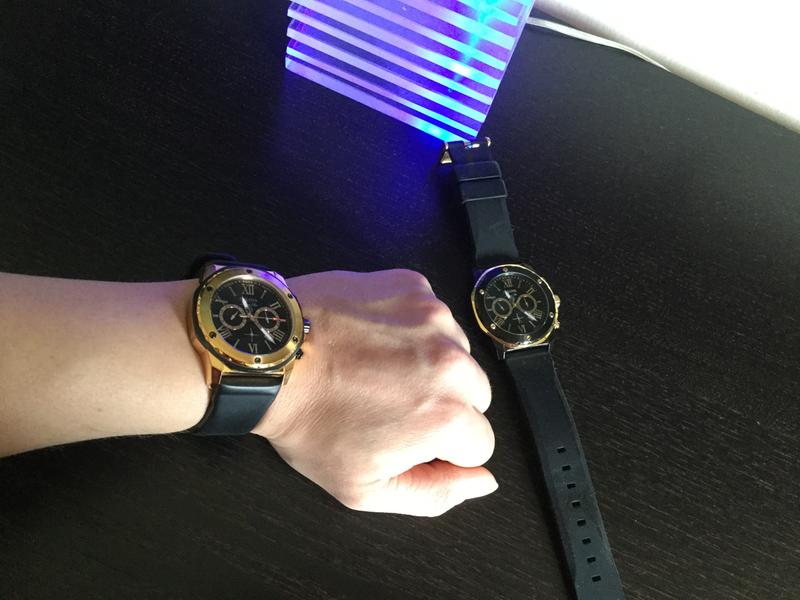 Rose gold-tone stainless steel case with a black rubber strap. Fixed rose gold-tone bezel. Black dial with luminous rose gold-tone hands and alternating index and Roman numeral hour markers. Minute markers around the outer rim. Dial Type: Analog. Luminescent hands and markers. Date display between the 4 and 5 o'clock positions. Chronograph - three sub-dials displaying: 60 seconds, 60 minutes and 24 hours. Quartz movement. Scratch resistant mineral crystal. Pull / push crown.