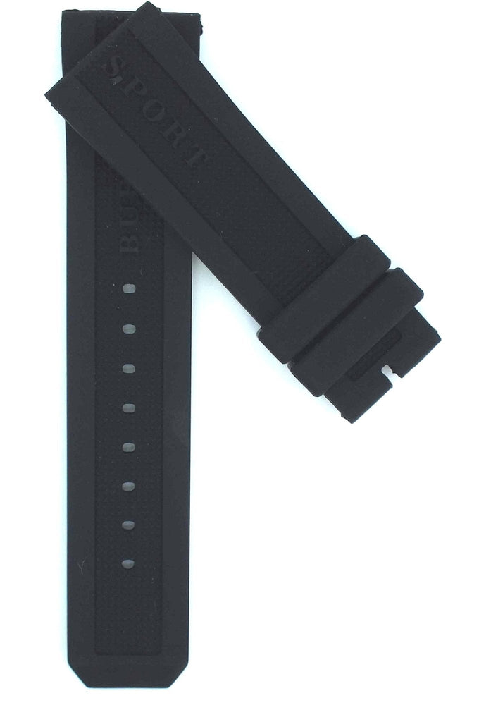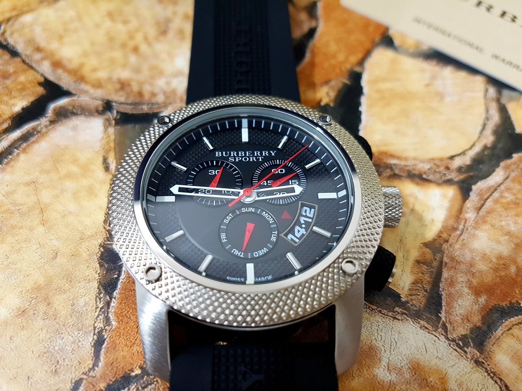 Stainless steel case with a black rubber strap. Fixed stainless steel bezel. Black dial with skeleton hands and index hour markers. Minute markers around the outer rim. The Burberry name appears below the 12 o'clock position. Dial Type: Analog. Luminescent hands and markers. Date display at the 4 o'clock position. Chronograph - three sub-dials displaying: 60 second, 30 minute and day of the week. Quartz movement. Scratch resistant sapphire crystal. Screw down crown. Solid case back. Case diameter: 44 mm. Case thickness: 14 mm. Round case shape. Band width: 23 mm. Band length: 8 inches. Tang clasp. Water resistant at 100 meters / 330 feet. Functions: chronograph, date, day, hour, minute, second. Casual watch style. Watch label: Swiss Made Burberry Endurance Chronograph Black Dial Rubber Strap Men's Watch BU7700