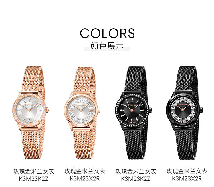 Calvin Klein minimal series is the most popular series in the CK watch family; the design is inspired by retro clocks, with a fusion of classic design and contemporary style; derived from this classic watch series, China's exclusive "Elf Series" remains the same Continuing the minimalist design, the pure color dial design contrasts with the PVD rose gold pointer scales, like stars on the wrist, shining all the time. The Milanese woven strap is modified according to the case size and is more comfortable. It is worth mentioning that the dial is inlaid with countless sparkling fine diamonds, and you can choose from two diamond-inlaid styles.
