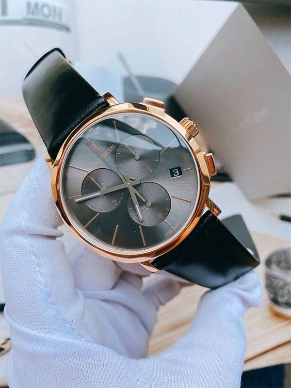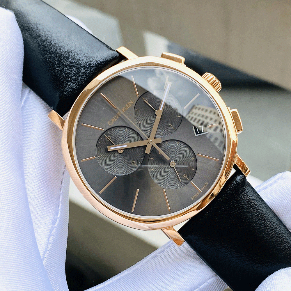 Rose gold PVD stainless steel case with a black leather strap. Fixed rose gold PVD bezel. Dark grey dial with luminous rose gold-tone hands and index hour markers. Minute markers around the outer rim. Dial Type: Analog. Luminescent hands. Date display at the 4 o'clock position. Chronograph - three sub-dials displaying: 60 second, 60 minute and 1/10th of a second. Quartz movement. Scratch resistant mineral crystal. Pull / push crown. Solid case back. Round case shape. Case size: 42 mm. Case thickness: 12 mm. Band width: 22 mm. Tang clasp. Water resistant at 30 meters / 100 feet. Functions: chronograph, date, hour, minute, second. Casual watch style. Watch label: Swiss Made. Calvin Klein Posh Chronograph Quartz Dark Grey Dial Men's Watch K8Q376C3.