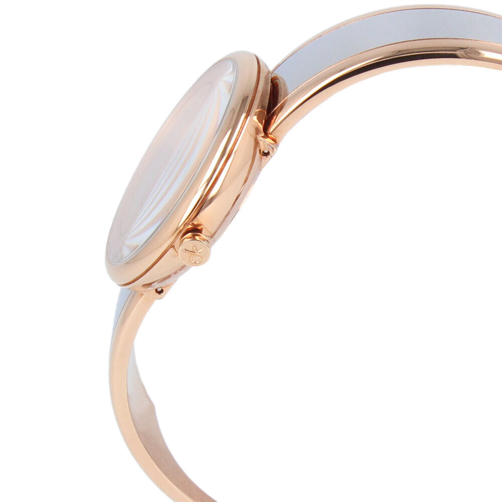 Rose gold-tone stainless steel case with a two-tone (rose gold-tone and silver stainless steel bracelet. Fixed rose gold-tone bezel. Silver dial with rose gold-tone hands. No markers. Dial Type: Analog. Quartz movement. Scratch resistant mineral crystal. Pull / push crown. Solid case back. Round case shape. Case size: 30 mm. Case thickness: 8 mm. Band width: 14 mm. Foldover clasp. Water resistant at 30 meters / 100 feet. Functions: hour, minute. Seduce Series. Casual watch style. Watch label: Swiss Made. Calvin Klein Seduce Quartz Silver Dial Ladies Watch K4E2N61Y.