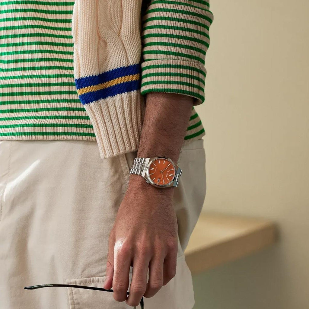 • Case Width: 40 mm, Case Material: Stainless Steel, Case Depth: 11.7 mm, Crystal: Scratch Resistant Sapphire, Calibre: 8210, Clasp: Fold Over with Safety Release, Dial Colour: Orange.