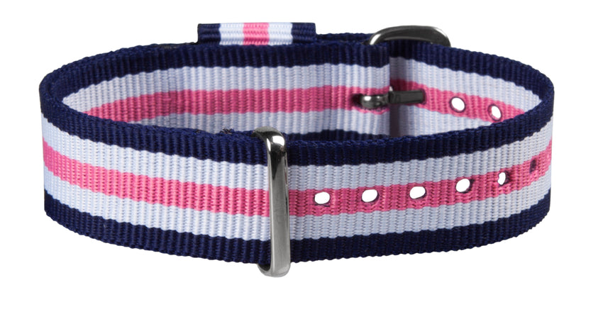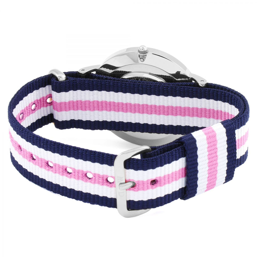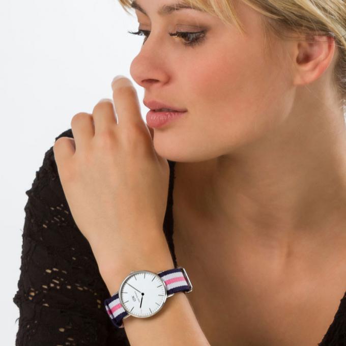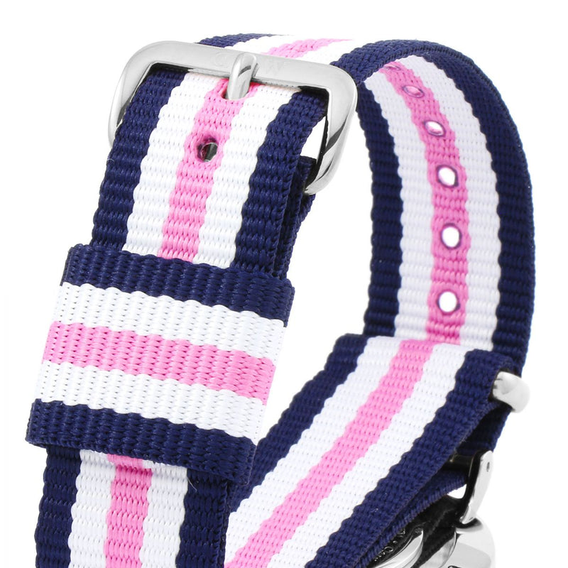 This slim-line Daniel Wellington Classic Southampton Silver Ladies Watch features a 36mm Polished Stainless Steel case, White Dial and fitted with a high quality Japanese quartz movement. This model is supplied with a signature Blue, White and Pink Nato strap.