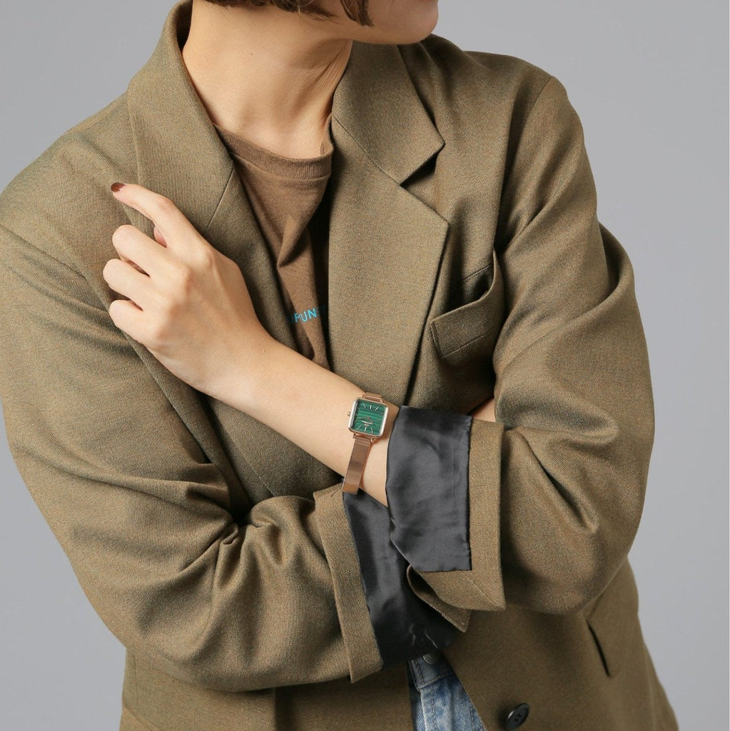 The Quadro Studio features a delicate and petite, glossy emerald green dial, complemented by the sleek Piano strap. Crafted with polished stainless steel and available in a refined rose gold plating. A retro statement with timeless appeal.