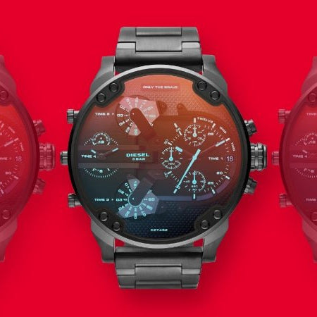 Diesel watches are oversized, colorful and eye-catching with uniquely-shaped cases. From chronographs to digital to multiple time zones.