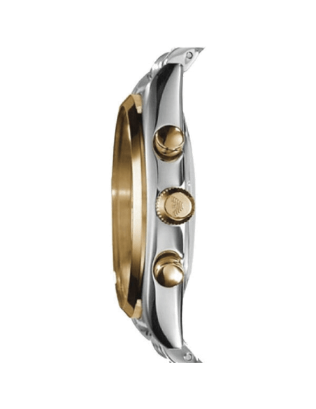 Two-tone (silver-tone and gold-tone) stainless steel case and bracelet. Fixed two-tone (silver-tone and gold-tone) stainless steel bezel. Silver dial with gold-tone hands and Arabic numeral hour markers. Minute markers around the inner rim. Dial Type: Analog. Luminescent hands. Date display between 4 and 5 o'clock position. Chronograph - three sub-dials displaying: 60 second, 60 minute and 24 hour. Quartz movement. Scratch resistant mineral crystal. Pull / push crown. Solid case back. Round case shape, case size: 43 mm. Deployment with push button release clasp. Water resistant at 50 meters / 165 feet. Functions: chronograph, date, hour, minute, second. Classic Series. Casual watch style. Emporio Armani Classic Silver Dial Two-tone Stainless Steel Chronograph Men's Watch AR0396.