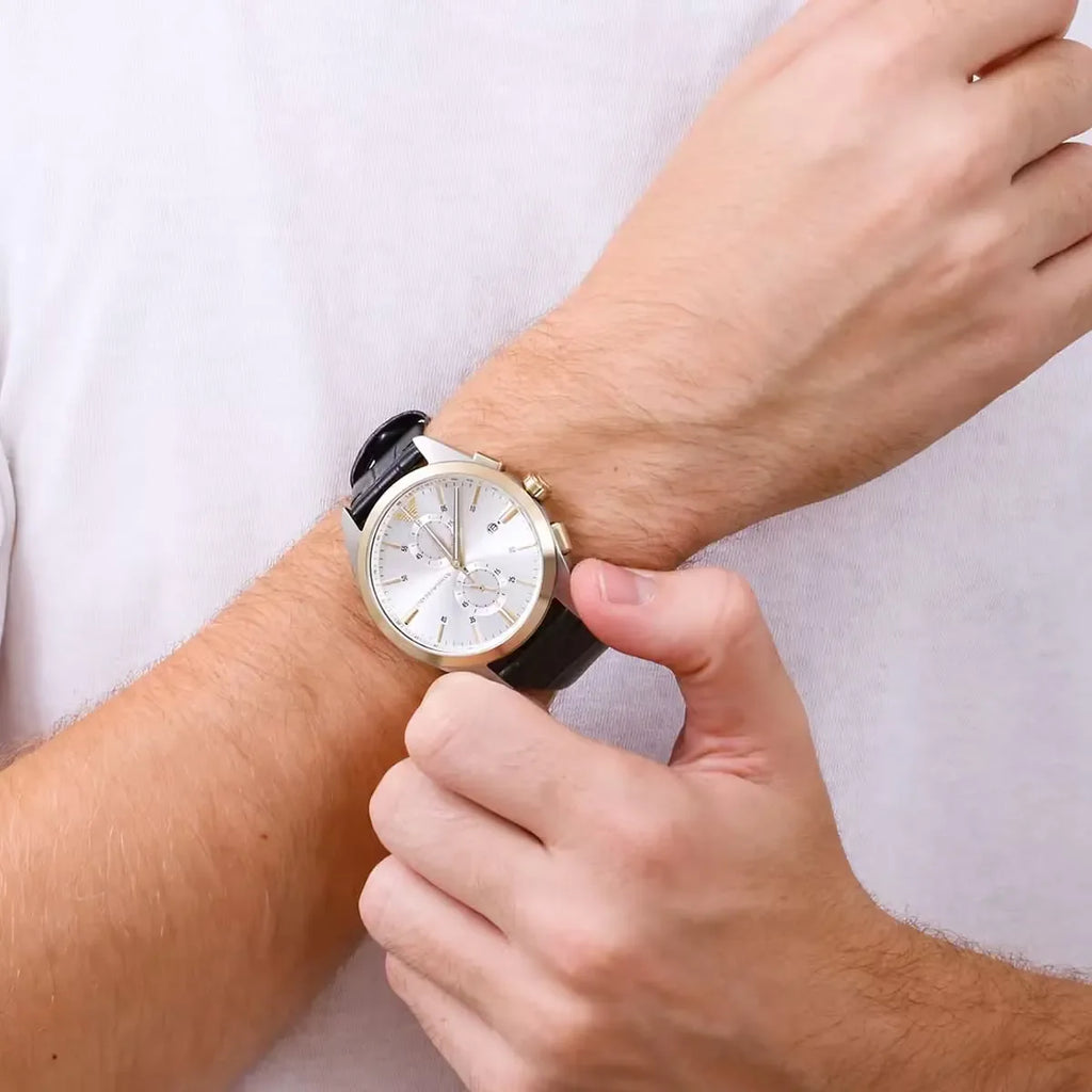 Emporio Armani Claudio Chronograph Silver Dial Black Leather Strap Watch For Men - AR11498 Buy Now By Emporio Armani